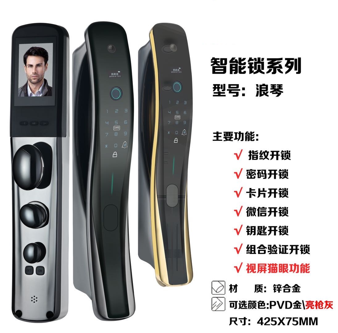功能:指紋開鎖,APP遠(yuǎn)程開鎖,密碼開鎖,微信開鎖,貓眼開鎖